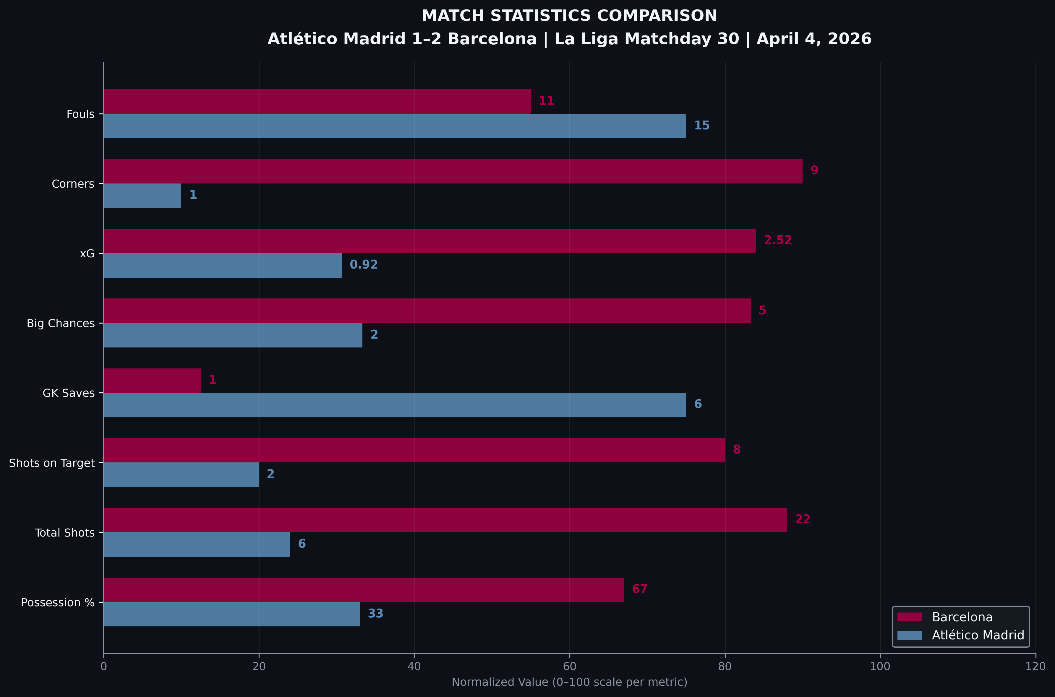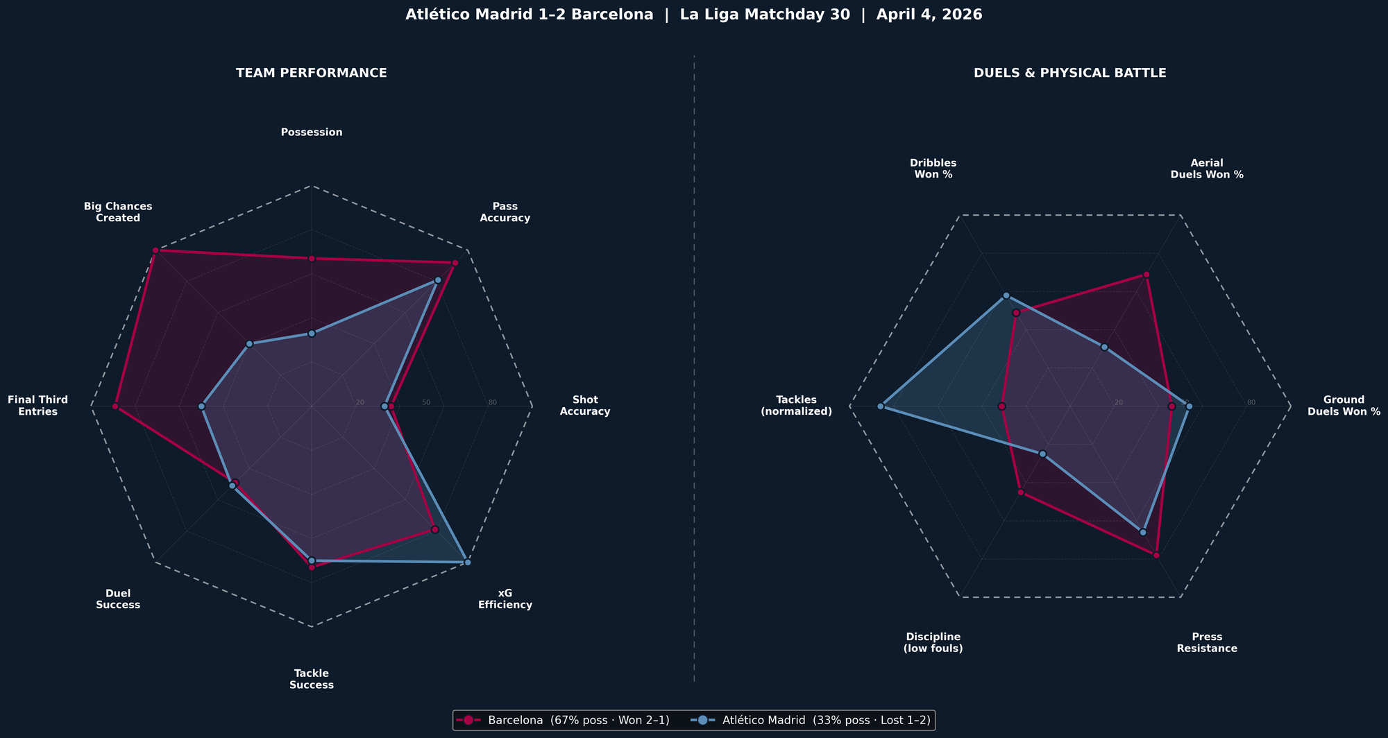 The numbers at halftime told two separate stories about the same game. One was Barcelona's — 67% possession, 92% pass accuracy, 89% of passes in the final third completed, five big chances created to Atlético's two. The other belonged to Atlético. They won the ground battle, 54% to 46%. They made 30 tackles to Barça's eleven. Their press resistance held across the first half despite being pinned back. This was a team that was dominated in every territorial and creative metric and still won the contest that happens below the surface — the one fought in the grass, with studs and shoulders and second balls. They were not outrun. They were not outmuscled.