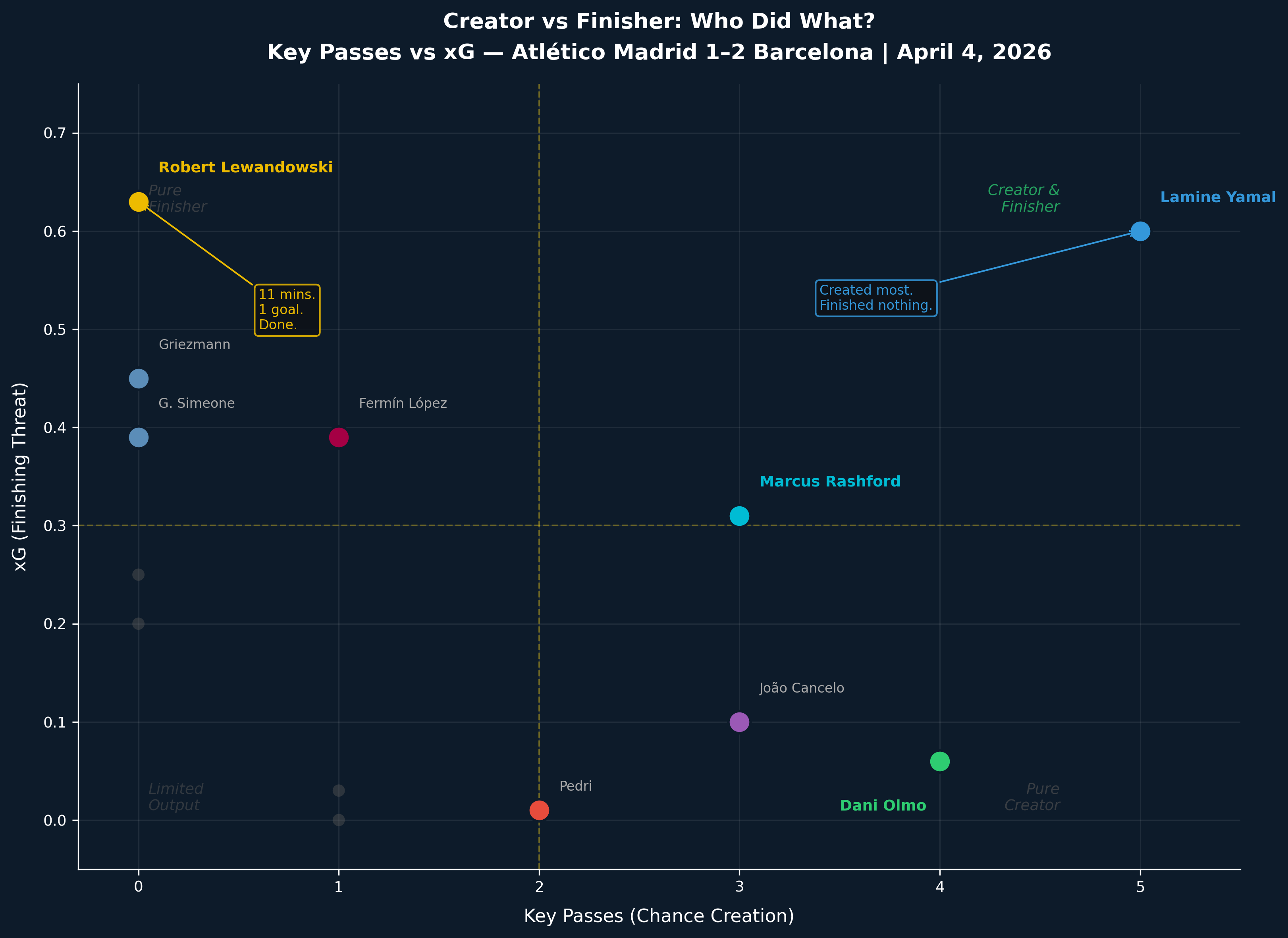 Lamine Yamal sits alone at the far right of that chart: five key passes, the highest of any player on the pitch. He hit the post, missed a big chance, generated 0.60 xG — the highest individual figure in the match. He also lost possession 27 times. More than anyone else. Both teams combined. That is the paradox of watching Yamal on a night like this: he was simultaneously the most creative and most chaotic player in the ground. Every cross failed — five attempted, zero accurate. Every run created danger. Every touch carried risk and reward in equal measure. He was the source of Atlético's greatest anxiety and Barça's greatest frustration, sometimes in the same moment.