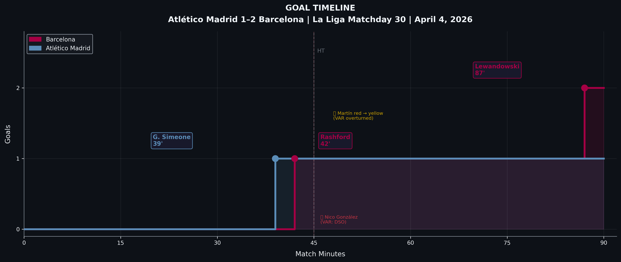 Then came the first act of theatre. Nico González, already booked, lunged at Yamal on the edge of the box in first-half stoppage time. The referee showed a second yellow. VAR upgraded it: denial of a goalscoring opportunity. Straight red. Atlético went into the break level, a man down, and furious.