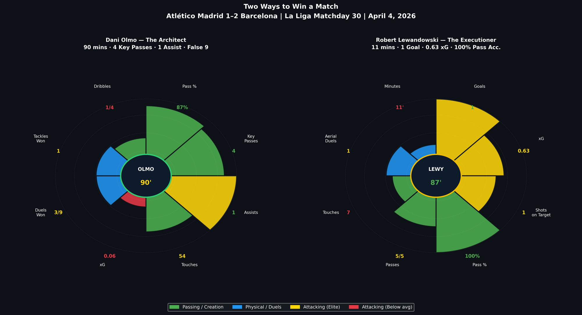 Put them side by side and the contrast is almost comic. Olmo's chart is wide and green — 90 minutes of constant involvement, key passes radiating outward, the assist wedge glowing gold. Lewandowski's is concentrated, almost spare — almost nothing except the two attacking metrics that matter most: xG and goal. He touched the ball seven times and one of them went in. Olmo touched it 54 times and unlocked the game three times over, including the pass that created the equaliser and the constant dragging of defenders out of position that gave Rashford room to finish. Neither man's contribution makes sense without the other. Olmo built the platform all evening. Lewandowski walked onto it and pressed the button.