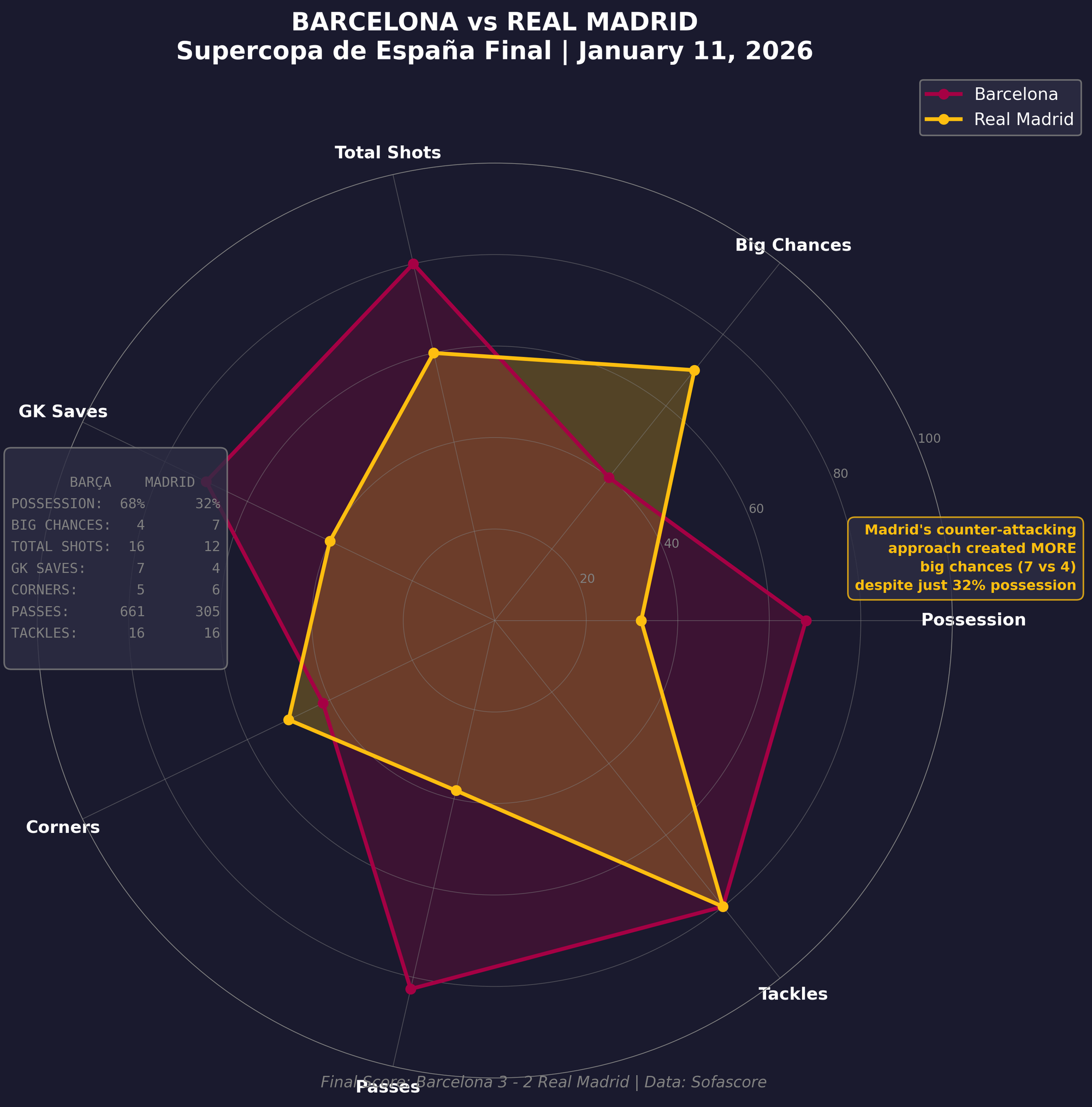Xabi Alonso's tactical setup was bizarre—a back five, sitting deep, absorbing pressure, waiting to counter. This is Real Madrid we're talking about. The club that has built its identity on domination, on imposing their will, on making opponents fear them from the first whistle. Instead, they were content. Passive. Reactive. Barcelona had nearly 70% possession and still struggled to create meaningful chances because Madrid simply didn't engage.