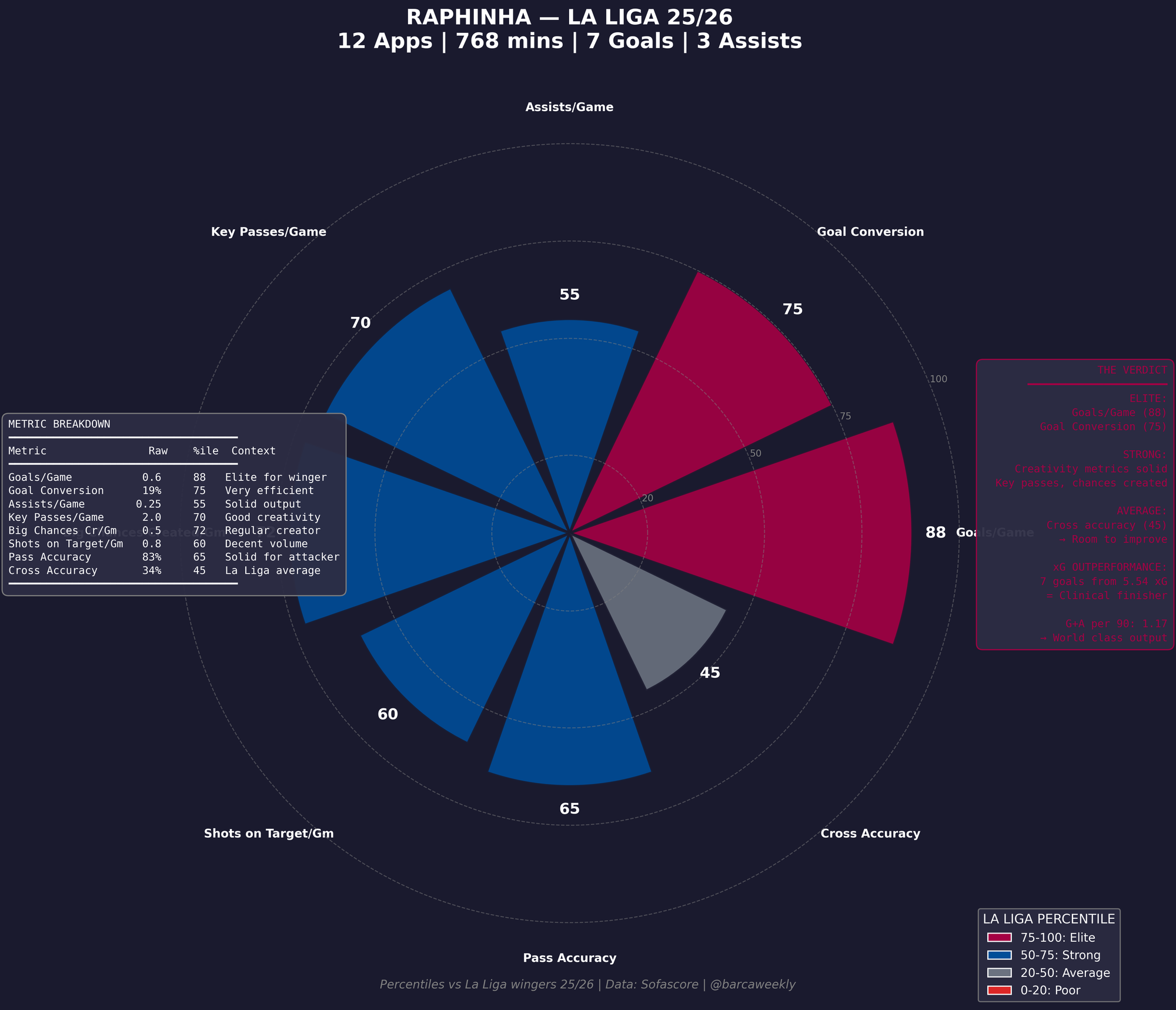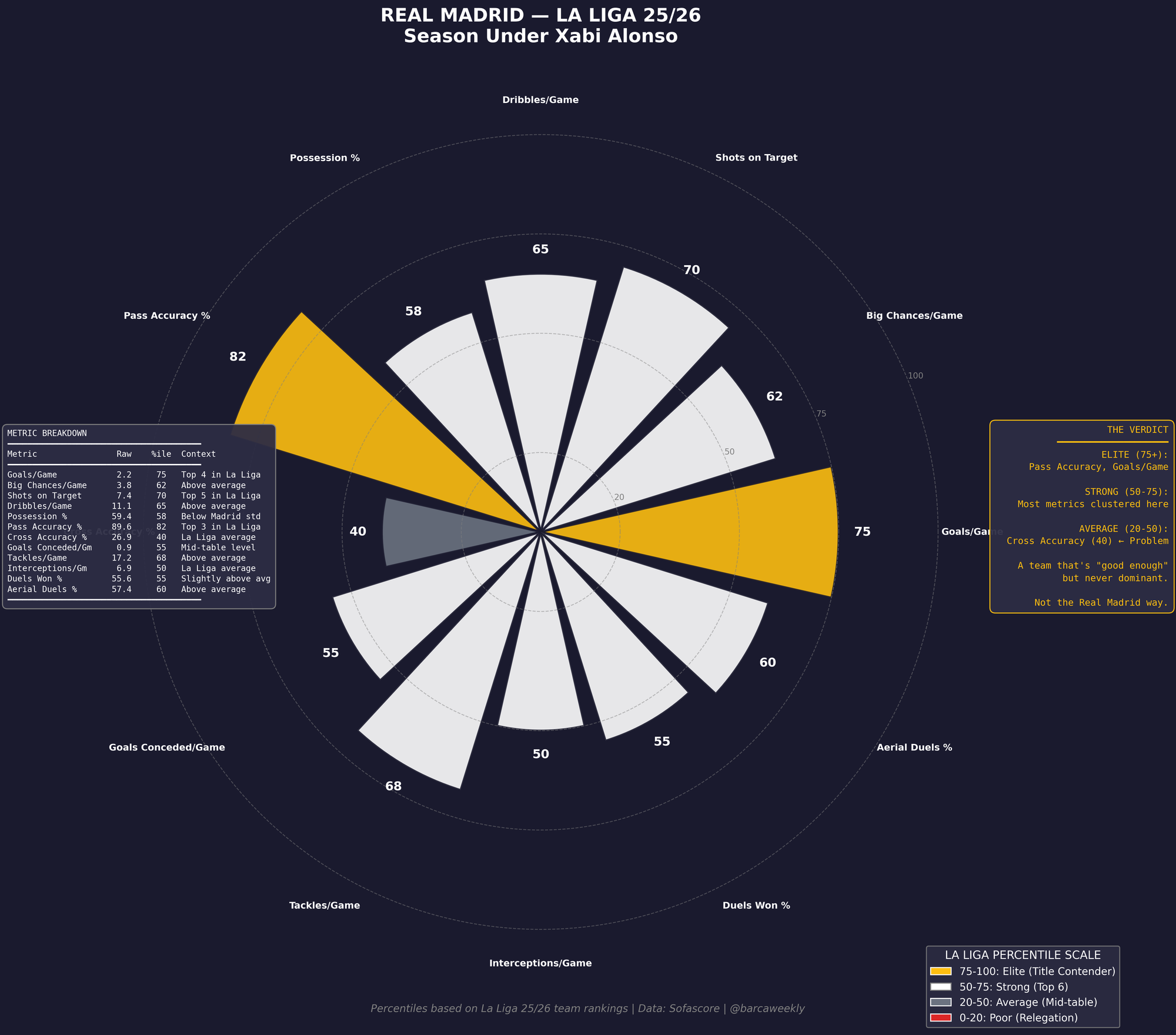 And this gets clearer as you look into the season stats for Madrid in La Liga normalised to other La Liga teams. Look at all that white. Real Madrid under Xabi Alonso weren't bad — they were acceptable, and that's the problem. Almost every metric sits in the 50-75 "Strong" band, the territory of a team that finishes third or fourth and calls it progress. Only Pass Accuracy (82) and Goals/Game (75) touch elite levels, and even those are carried by individual brilliance rather than system. Meanwhile, Cross Accuracy (40) sits in gray mediocrity, and Possession at 58 is damning for a club that built its modern identity on suffocating opponents with the ball. Madrid fans don't want a team that's "good enough" — they want domination. This chart shows a side that was consistently above average and never once outstanding.